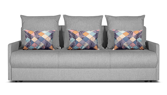 Главная особенности модели – наличие узких прямоугольных подлокотников 4 см шириной. Такое конструктивное решение позволяет экономить пространство комнаты. Идеально подходит для узких, небольших комнат. Наполнитель – пенополиуретан, которые быстро восстанавливает первоначальную форму и мало весит. Благодаря ППУ обеспечивается удобство, износоустойчивость модели. Поскольку в сложенном виде место для сидения достаточно широкое, для удобства рекомендовано использовать подушки, которые идут в комплекте - три для спинки и три декоративные.